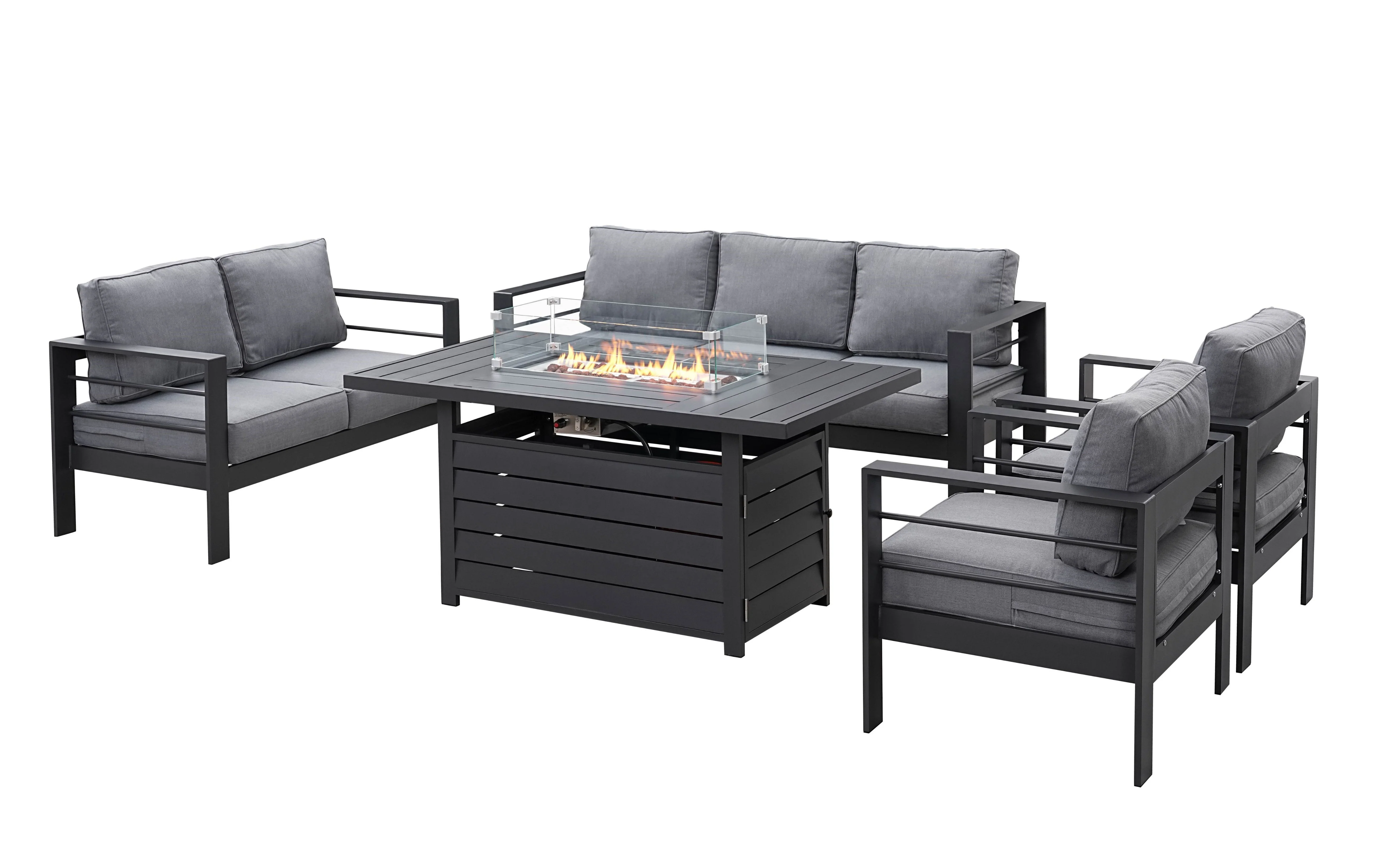 Modern 7-Seater Aluminium Fire Pit Lounge Set (3 Seater, 2 Seater, 2 Armchairs) Grey